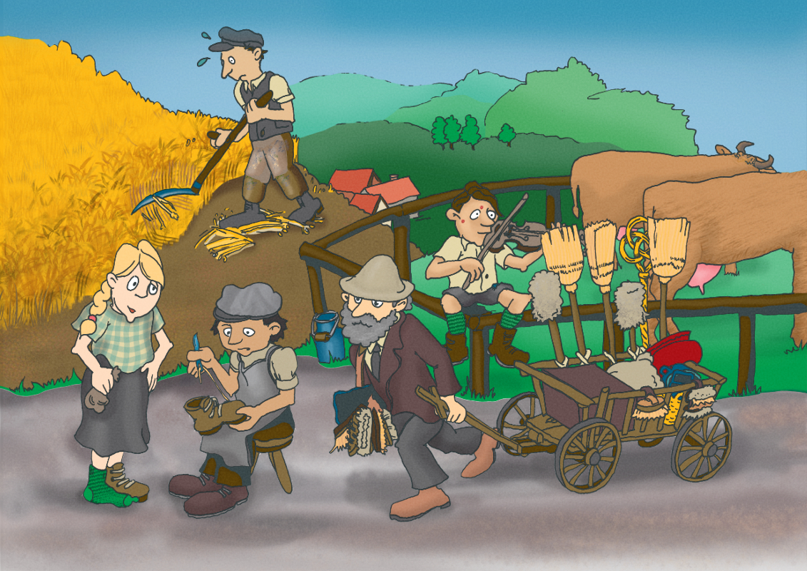 Um das Thema Wandermusikantentum auch in Schulen und Vorschulgruppen von Kindergärten zu verorten, wurden Bildkarten für ein Kamishibai Erzähltheater entworfen. Die, liebevoll von Nadja Donauer gestalteten, Bildkarten erzählen die Geschichte einer fiktiven Wandermusikantenfamilie.